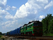 2007.06.09, Kyviskes, 2TE10M-2850 z pociągiem towarowym zjeżdża na obwodnicę Wilna. Mechanik pozdrawiał nas pięknym RP1, pięknym pióropuszem oraz zapaleniem na chwile świateł :) |