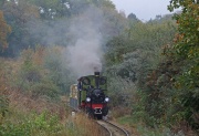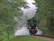 18.10.2009 Poznań. Parowóz Borsig z pociągiem turystycznym do Poznańskiego Zoo znika w lasku. |