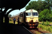 1 lipca 2000 | Jasień | Pociąg specjalny z Gubinka do Żagania mija zdewastowaną nastawnię wykonawczą na stacji Jasień. Jeszcze parę lat temu taki widok był standardem na węźle Żary - Żagań, dziś zamiast odstraszających ruder, pozostałości infrastruktury, pozostały jedynie gruzy... Jutro wyjeżdżam na tygodniowe (coroczne) eksploracje tego najpiękniejszego w Polsce spalinowego węzła... Już się boję tego co ujrzą ( a raczej czego już nie ujrzą) moje oczy... |