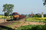 Zblewo | 17.06.2010 | 16:21 | Pociąg towarowy relacji Zdzieszowice Koksownia - Gdańsk Port Północny, prowadzony przez ST44-927 i SM42-1027, mija zrujnowaną nastawnię w Zblewie. |