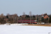 05.05.2013. W zachodzącym słoneczku EN57-872 jako weekendowy IR"Giewont" z Zakopanego do Częstochowy kilka minut po wyjechaniu z Jeleśni jedzie do Żywca.Tam nastąpi zmiana czoła.Zapełnienie nawet...nawet.