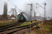 20 grudnia 2014 r. ST44-949 i SM42-1322 na czele pociągu towarowego nr 114173 rel. Sokółka - Warszawa Wsch. Tow. pokonują odcinek między Kętrzynem i kiedyś węzłową stacją w Nowym Młynie. Na horyzoncie Bazylika św. Jerzego, często mylona ze znacznie mniej okazałym kętrzyńskim zamkiem. // Widoczny pociąg to jeden z wielu składów objazdowych, skierowanych na trasę przez Ełk, Korsze, Olsztyn w związku z zamknięciem między Białymstokiem a Warszawą. |