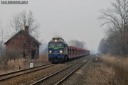 A short time ago M62M-017 left with a train loaded with kaolin the small station of Sobótka Zachodnia. It runs northwards in the direction of Wrocław. In Sobódka the route has a turn and the train nearly runs in the opposite direction. There is a good place to take a photo with the typical hill of this area ... the Ślęża. |