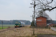 14.03.2015r.| Lokomotywa SU45-115 z pociągiem specjalnym Noteć relacji Czarnków - Poznań Główny mija "podany" semafor wjazdowy na stację Bzowo Goraj. Jednak gdyby stacja ta była czynna, powinny być uniesione dwa ramiona. |