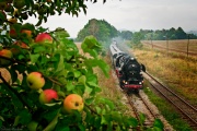 26.09.2015r.| Parowóz Kp4-3772 przybyły z Bieszczadzkiej Kolei Leśnej stoi przed halą lokomotywowni w Rogowie w towarzystwie miejscowej Lyd1-215. |
