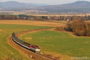 Chrenovec - Prievidza | 20.03.2015 | 13:37 | Pociąg towarowy Pn 63820 relacji Horna Stubna - Novaky pokonuje kolejne kilometry swojej trasy, zbliżając się do Prievidzy. Na czele 5 cystern i jednej platformy jadą trzy "Bardotki": 751.075-3, 751.035-7 i 751.047-2. Poranny skład relacji przeciwnej był znacznie dłuższy i cięższy, stąd obsługa aż 3 lokomotywami. A profil linii należy do dość trudnych. |