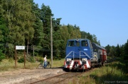 27.08.2016r.| Lokomotywa TGM40-0716 z pociągiem turystycznym relacji Bytów - Lipusz mija drewnianą stodołę chwilę po ruszeniu z przystanku Osława Dąbrowa i podąża w stronę Rogu. |