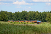 29.07.2020, Powały. V10C-555 z pociągiem turystycznym Płociczno Tartak - Krusznik zbliża się do leśnego przystanku Binduga. Tuż przy nim utworzony jest punkt widokowy na Jezioro Wigry. |