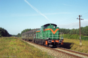 24.08.1999, Pierwszy poranny pociąg osobowy z Nakła n. Notecią do Chojnic wynurza się z zacienionego lasu i niespiesznie mija wieś Angowice. Skan negatywu. Robiąc to zdjęcie miałem pewien niedosyt, że skład ryflaków prowadzi kociołek w malowaniu jasnozielonym, gdyż wtedy jeszcze można było spotkać maszyny w ciemniejszym kolorze. Ale już wiedziałem, że ten skład przechodzi na pociąg do Kościerzyny, więc wybrałem się na następny motyw. |